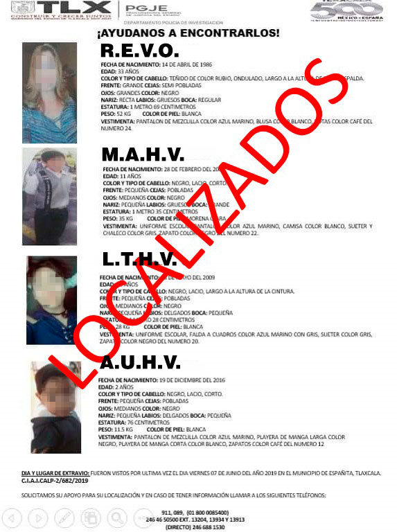 Posteriormente, el 18 de septiembre Elizabeth N., acompañada de sus tres hijos acudieron a las instalaciones de la Procuraduría de Tlaxcala, para informar que salió de su domicilio ubicado en el municipio de Españita por problemas familiares; además, aclaró que en ningún momento fueron privados de su libertad o víctimas de algún delito.