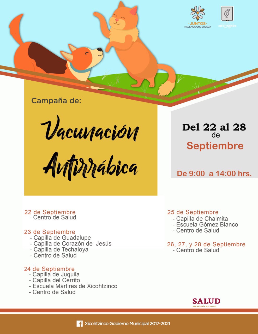 Para prevenir la rabia en perros y gatos, en el municipio de Xicohtzinco se realiza la Campaña de Vacunación Antirrábica del 22 al 28 de septiembregracias a la coordinación del Gobierno Municipal con la Secretaría de Salud.