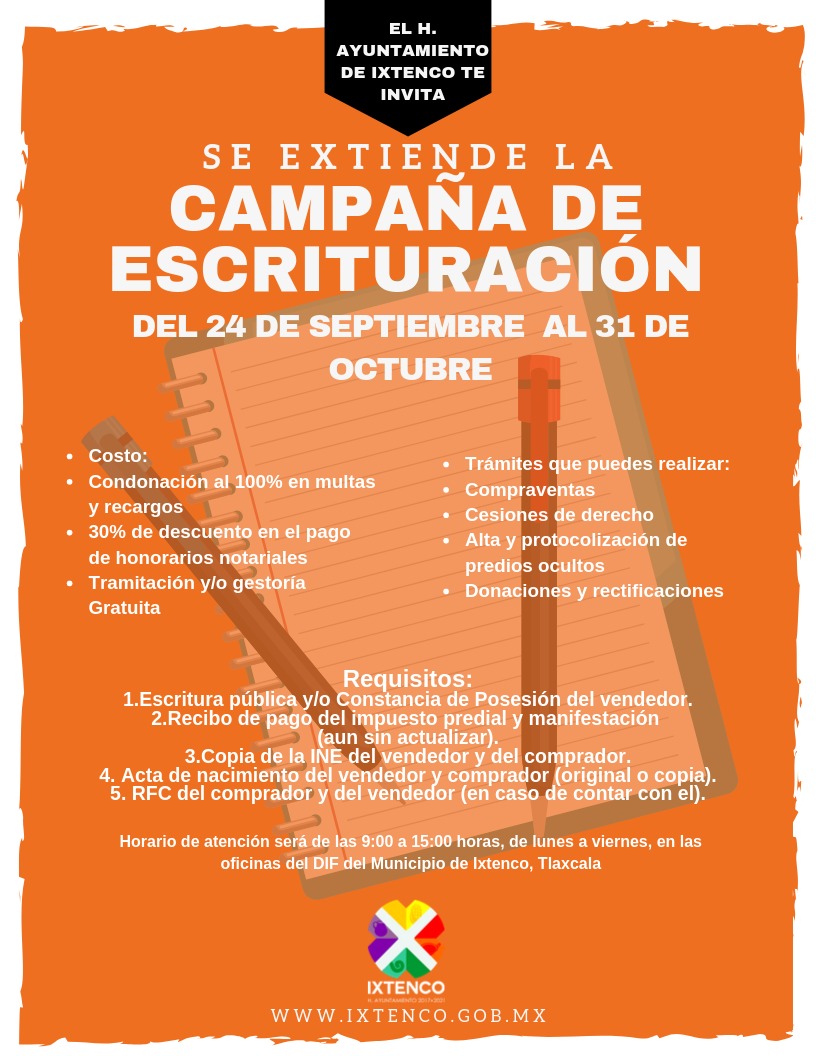 Debido a la demanda ciudadana, el Gobierno Municipal de Ixtenco que encabeza Miguel Ángel Caballero Yonca, anunció que la campaña de escrituración a bajo costo se extiende hasta el 31 de octubre de la presente anualidad.