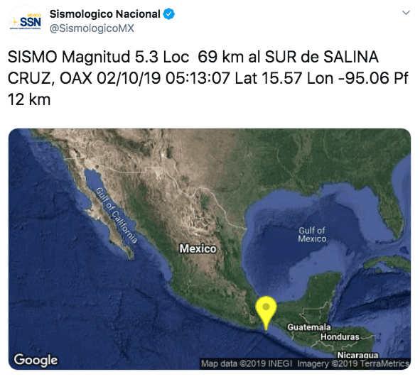 En punto de las 05:13 se registró un movimiento telúrico que de acuerdo con el Servicio Sismológico Nacional tuvo una magnitud de 5.3 grados y cuyo epicentro se localizó a 69 kilómetros al sur de Salina Cruz.