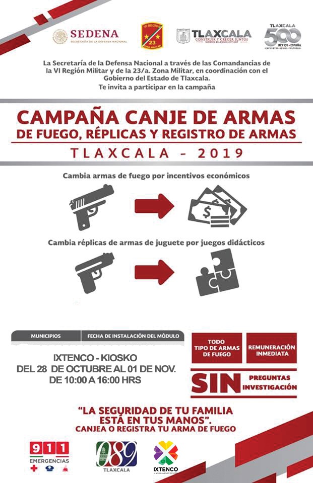 La 23/a. Zona Militar en coordinación con el Gobierno del Estado, anunciaron que no se llevarán a cabo investigaciones ni cuestionamientos a todos aquellos que entreguen todo tipo de armas de fuego, por las que recibirán además remuneración económica e inmediata.