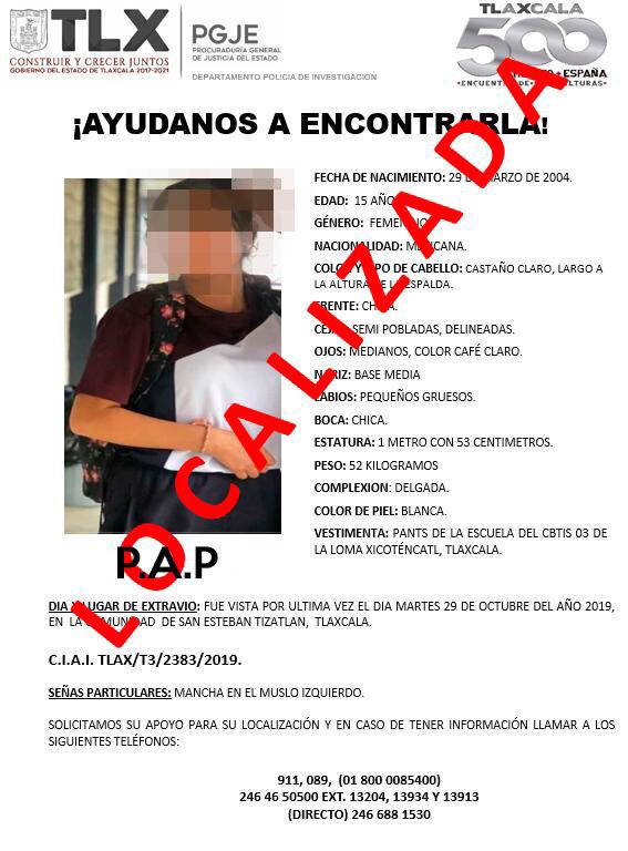 Lo anterior, luego que se informara que la joven fue vista por última vez el 29 de octubre del año en curso, cuando salió de su domicilio ubicado en la comunidad de San Esteban Tizatlán, en el municipio de Tlaxcala.