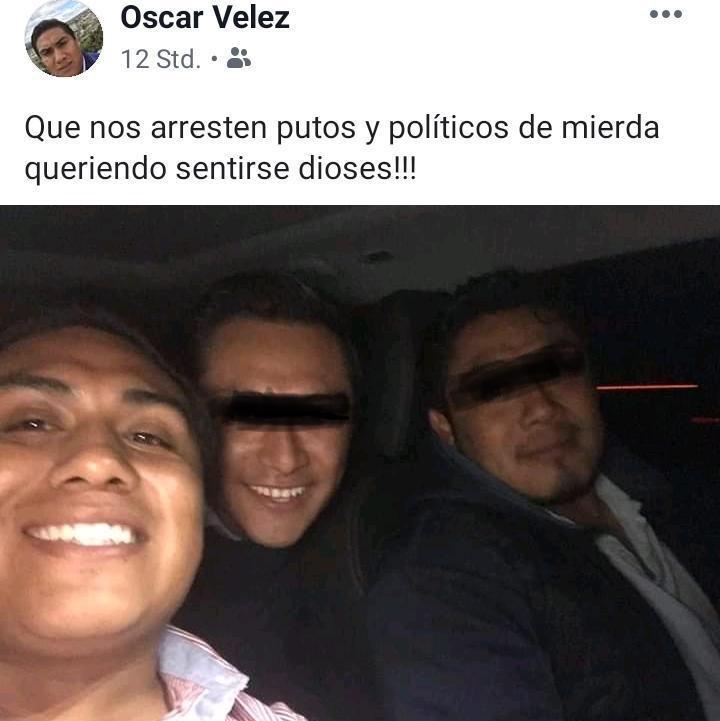 Asimismo, el presidente municipal, Oscar Velez Sánchez, publicó en su perfil de Facebook lo siguiente: “que nos arrastren putos políticos de mierda queriendo sentirse dioses”.