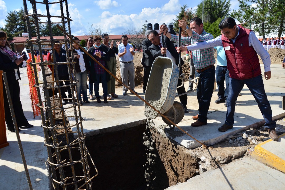 En este lugar se dieron cita autoridades educativas y municipales para poner en marcha los trabajos de la colocación de la primera piedra, que derivará en la construcción de cimentación y estructura de concreto armado, techumbre de acero y lámina galvanizada a dos aguas, en una superficie de 432 metros cuadrados.