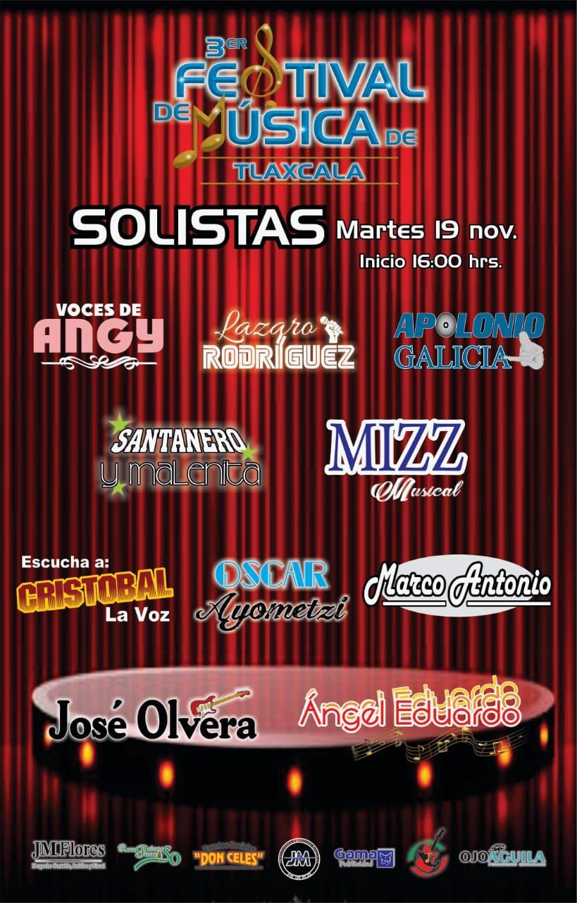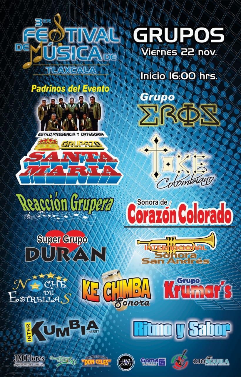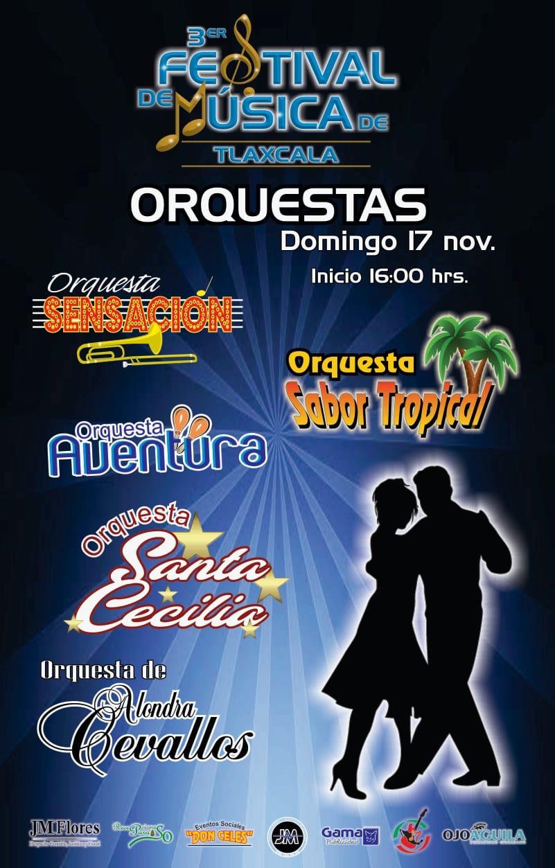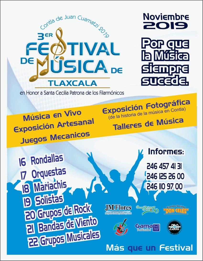 Del 16 al 22 de noviembre de realizará la tercera edición del Festival de Música de Tlaxcala en dónde gracias a la comisión organizadora se llevarán a cabo diversos eventos en los que se pretende dar a conocer y poner en alto el talento musical con el que se cuenta en Tlaxcala.
