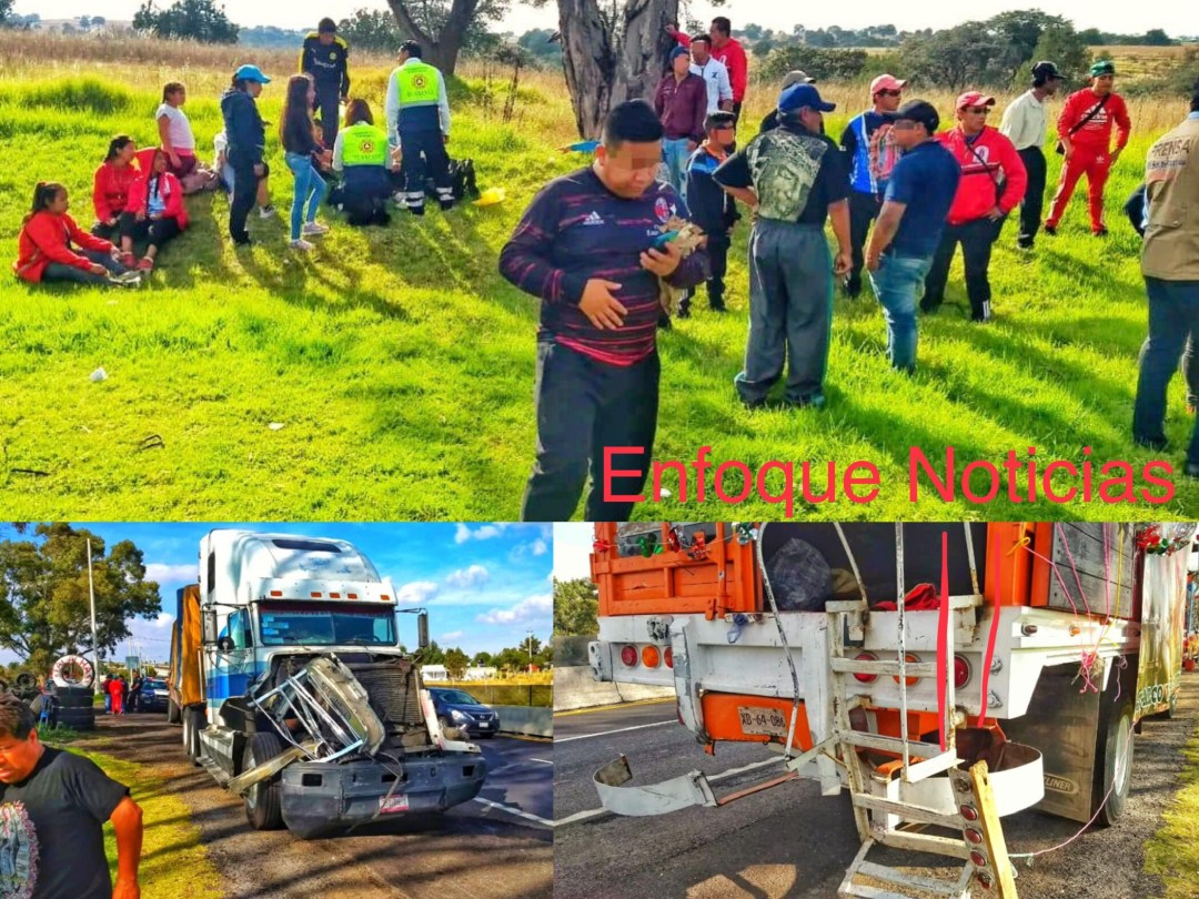 Esta tarde, un tráiler que posiblemente presentó una falla mecánica en los frenos, embistió de forma aparatosa a un camión que transportaba a peregrinos guadalupanos que se dirigían a su lugar de origen; el incidente ocurrió en la carretera México-Veracruz, a la altura del puente de Las Mesas, en Xaltocan.