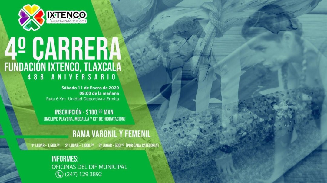 El Gobierno Municipal de Ixtenco, que encabeza Miguel Ángel Caballero Yonca, anunció la 4ta edición de la Carrera de Fundación de Ixtenco, que se llevará a cabo el próximo 11 de enero (2020) en punto de las 8:00 horas.