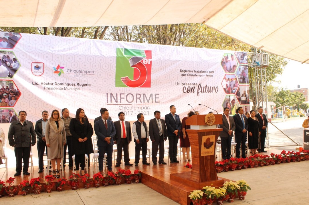 Ante ciudadanos, presidentes de comunidad, miembros del Cabildo, personal administrativo, e invitados especiales como ediles de otras demarcaciones, el alcalde Héctor Domínguez Rugerio rindió su tercer informe ciudadano en el que resaltó que uno de los avances más significativos en lo que va de su gestión, es la obra pública que ha beneficiado de forma consistente a gran parte de la ciudadanía chiautempense.