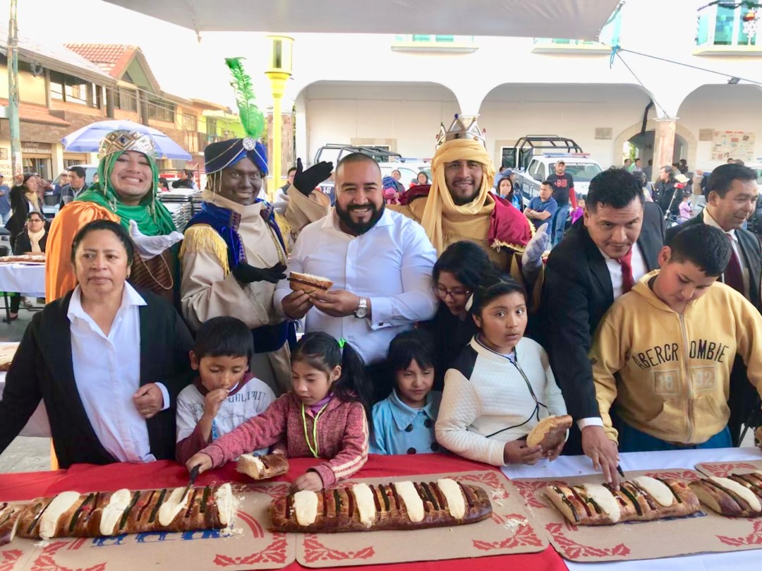 Cientos de infantes acompañados por sus papás celebraron el Día de Reyes en el municipio de Xicohtzinco, con una rosca de 100 metros, además de sorpresas y diversión.