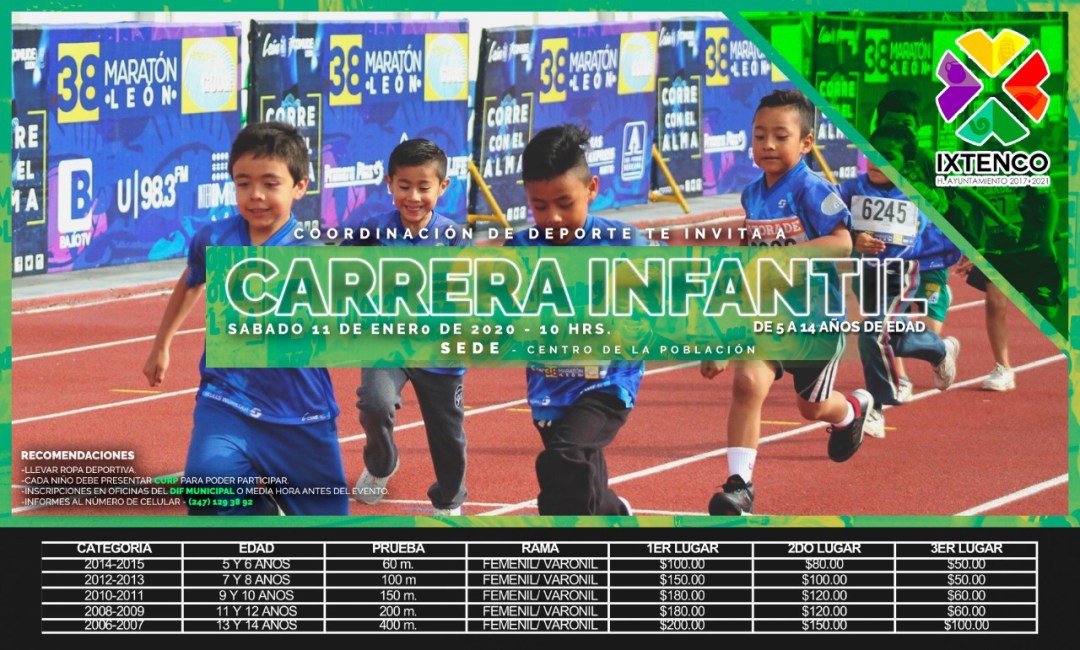 El Gobierno Municipal, que encabeza Miguel Ángel Caballero Yonca, informó que dentro de los eventos del 488º aniversario de la fundación de Ixtenco, se ha preparado la realización de la primera carrera infantil, que contempla 5 categorías mixtas y con premiaciones en efectivo para los tres primeros lugares de cada una.