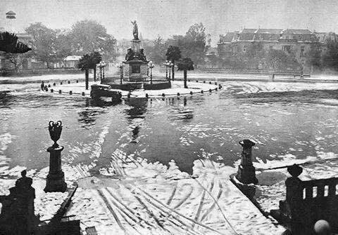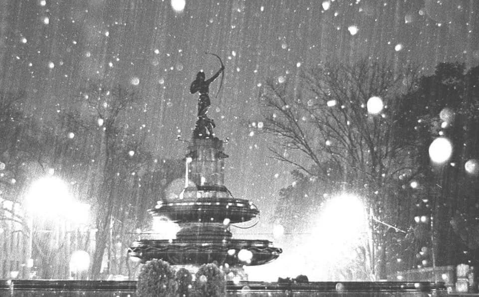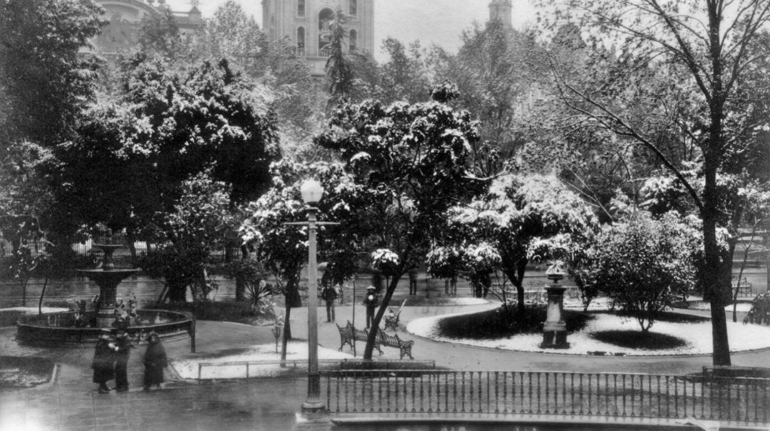 – En la foto: El zócalo de la Ciudad de México después de la nevada de 1907. Por los árboles y las fuentes podrían pensar que no es el Zócalo, pero viendo con atención al fondo aparece parte de La Catedral Metropolitana.
