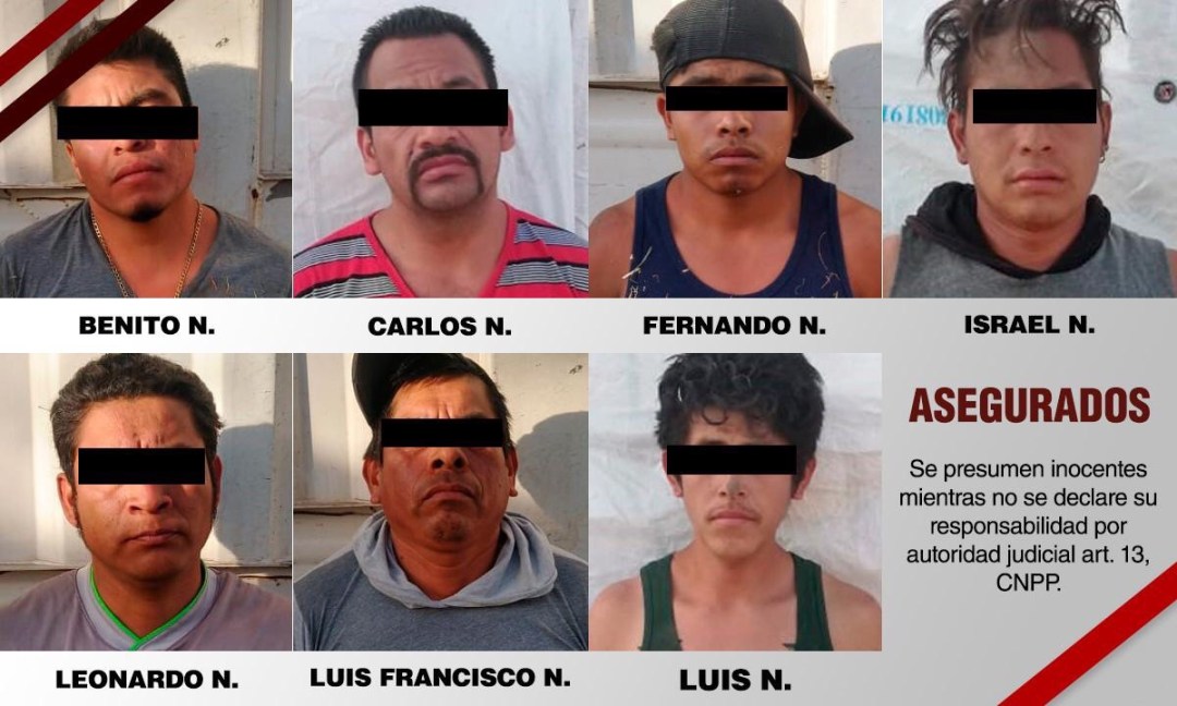 Por lo anterior, quienes dijeron llamarse Benito N., Fernando N.,Luis Francisco N., y Luis N., todos vecinos del estado de Puebla;Israel N., originario de Veracruz; Leonardo N., vecino de Tuxtepec, Oaxaca, y Carlos N., del municipio de Xiloxoxtla, fueron asegurados y puestos a disposición del Agente del Ministerio Público para deslindar o fincar responsabilidades.