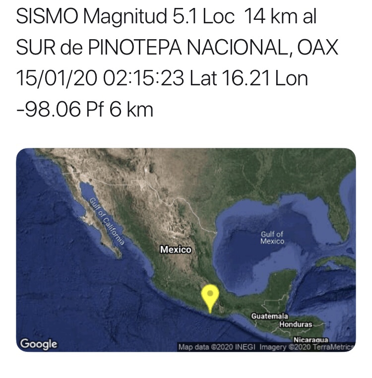 Cuatro sismos se registraron esta madrugada, entre la 1:44 y 3:27 horas con epicentro en las costas de Pinotepa Nacional Oaxaca, el más fuerte ocurrió a las 2:15 horas con magnitud de 5.1, este último fue poco perceptible en el centro del país.