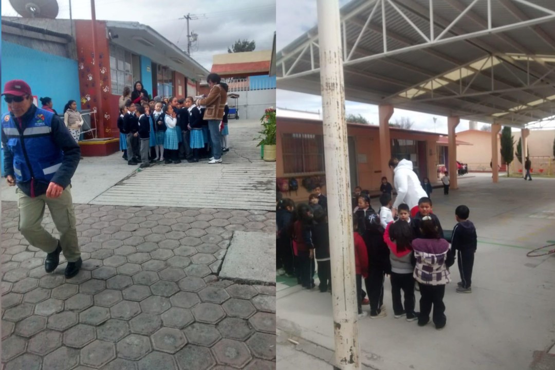 Las escuelas en participar fue el preescolar Sor Juan Inés de la Cruz y la escuela primaria Bimi Manandi Yumu, personal del área de Protección Civil Municipal simuló un sismo con hipótesis de 5 grados en la escala de Richter.