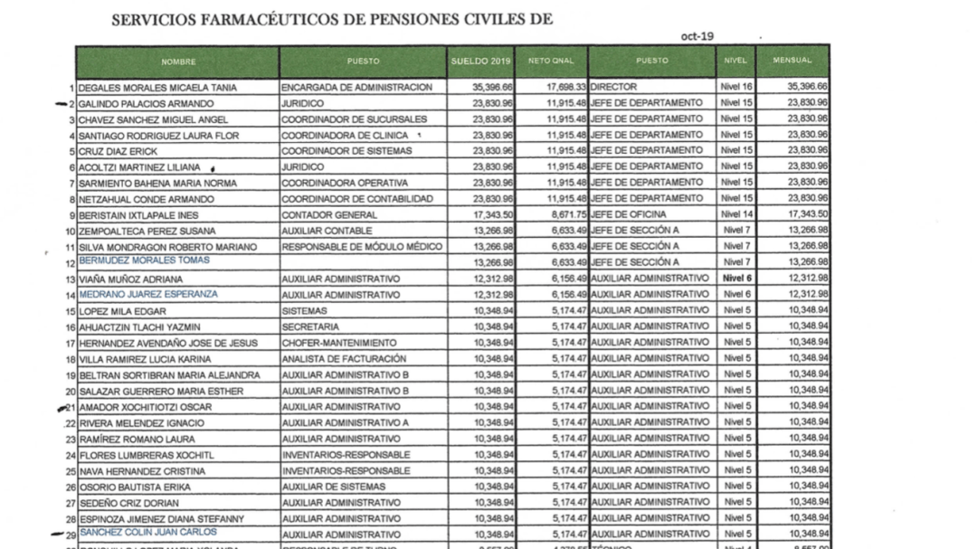 Respecto a los supuestos aviadores que mantendría en la nomina, señalaron al Jurídico, que labora en Servicios Farmacéuticos de Pensiones Civiles y quien aseguran «solo viene a firmar y gana la cantidad de $23, 830 libres».