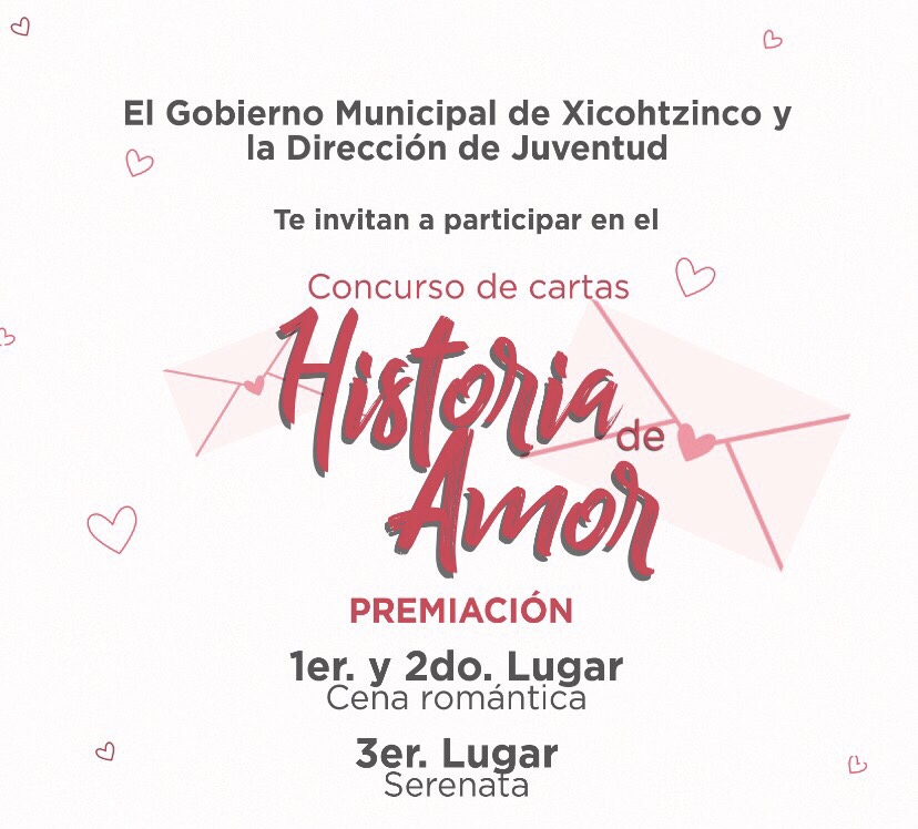 El Gobierno Municipal de Xicohtzinco a través de la dirección de Juventud hace un exhorto a la ciudadanía en general a participar en el concurso de cartas “Historias de amor”, como parte de la celebración del 14 de febrero.