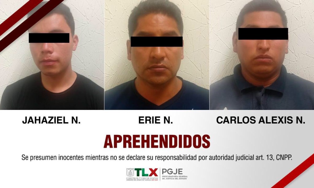 La Procuraduría General de Justicia del Estado (PGJE) cumplimentó una orden de aprehensión en contra de tres policías del municipio de Apizaco que responden a los nombres de Carlos Alexis N., Erie N., y Jahaciel N., por el delito de violación, por lo que fueron remitidos al Centro de Reinserción Social (Cereso) a la espera del desahogo de su audiencia inicial.