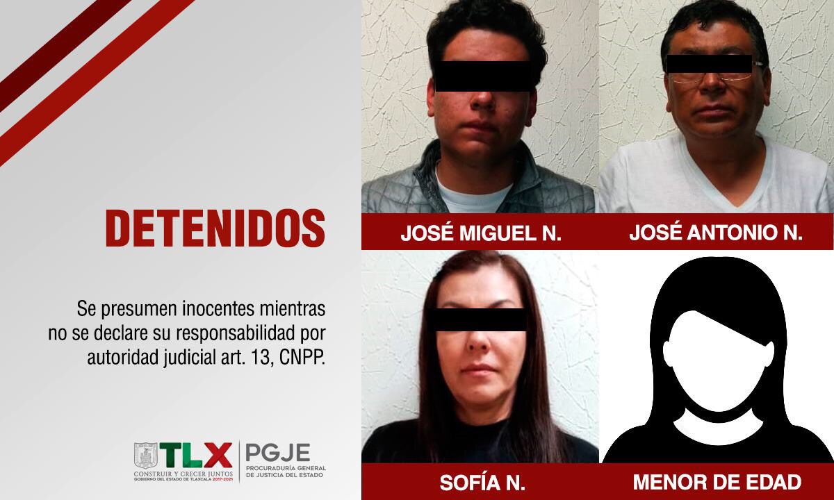 Posteriormente, elementos de la policía municipal de Apizaco en coordinación con la Policía de Investigación pusieron a disposición del Agente del Ministerio Público a José Antonio N., de 55 años de edad, José Miguel N., de 22, una menor de 15 años de edad y Sofía N., de 48 años; padre, hijo, hija y esposa, respectivamente.