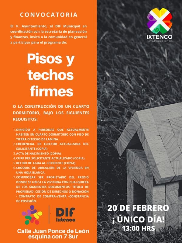 El Gobierno Municipal de Ixtenco que encabeza Miguel Ángel Caballero Yonca, en coordinación con la Secretaría de Planeación y Finanzas del Gobierno del Estado, abrieron la convocatoria para acceder al programa de pisos y techos firmes.
