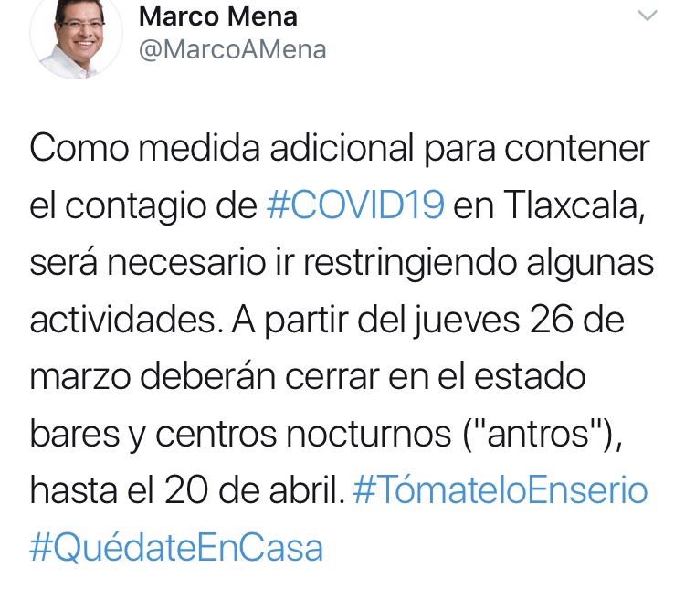 “Como medida adicional para contener el contagio de #COVID19 en Tlaxcala, será necesario ir restringiendo algunas actividades”.