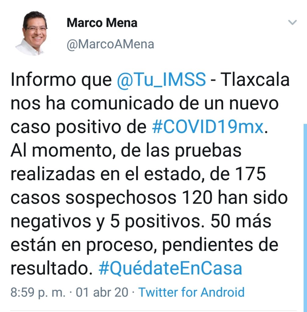 «Informo que @Tu_IMSS – Tlaxcala nos ha comunicado de un nuevo caso positivo de #COVID19mx».