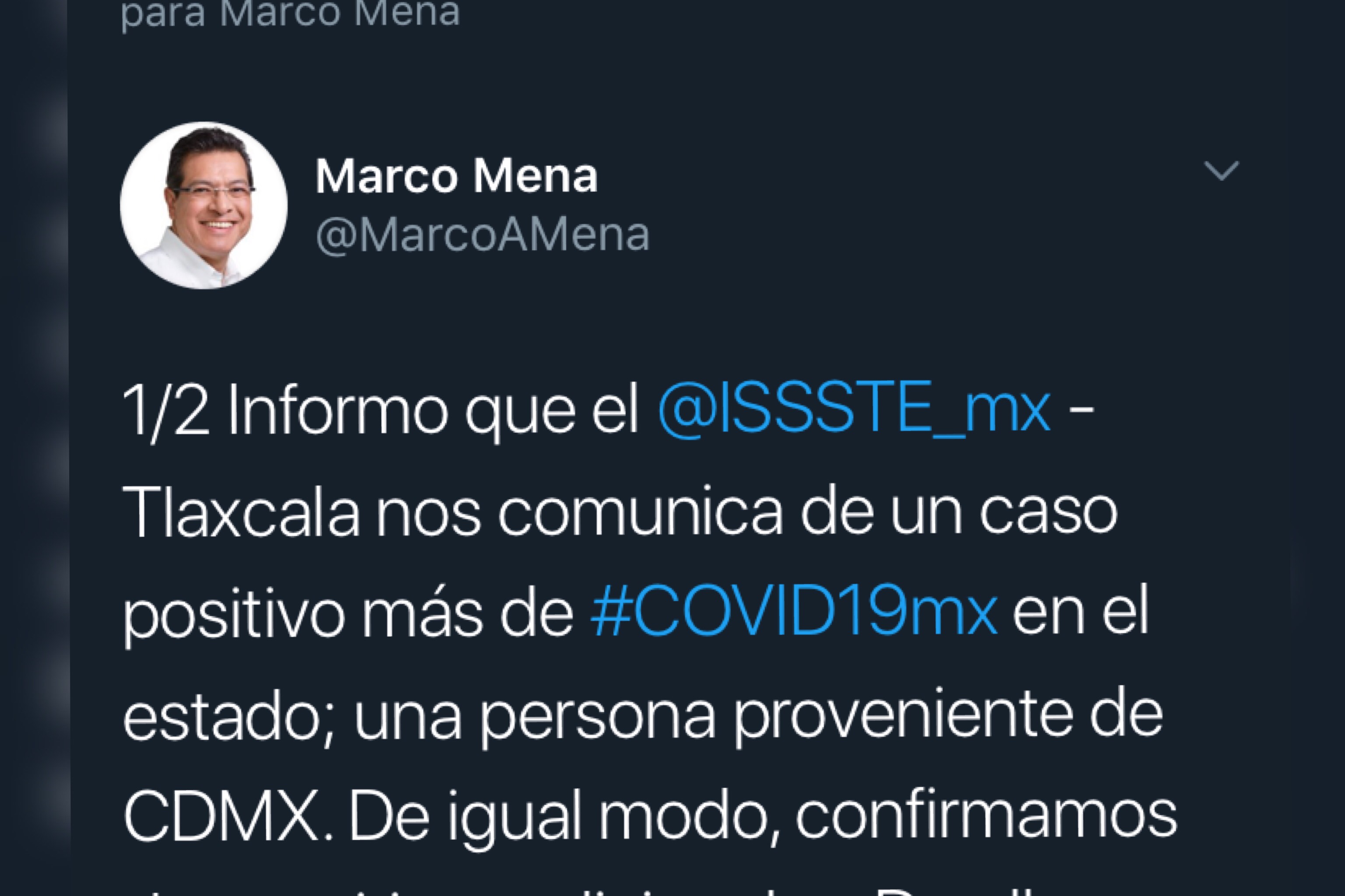 A través de sus redes sociales, el mandatario reportó que uno de estos casos fue reportado por el ISSSTE, que corresponde a una persona proveniente de CDMX.