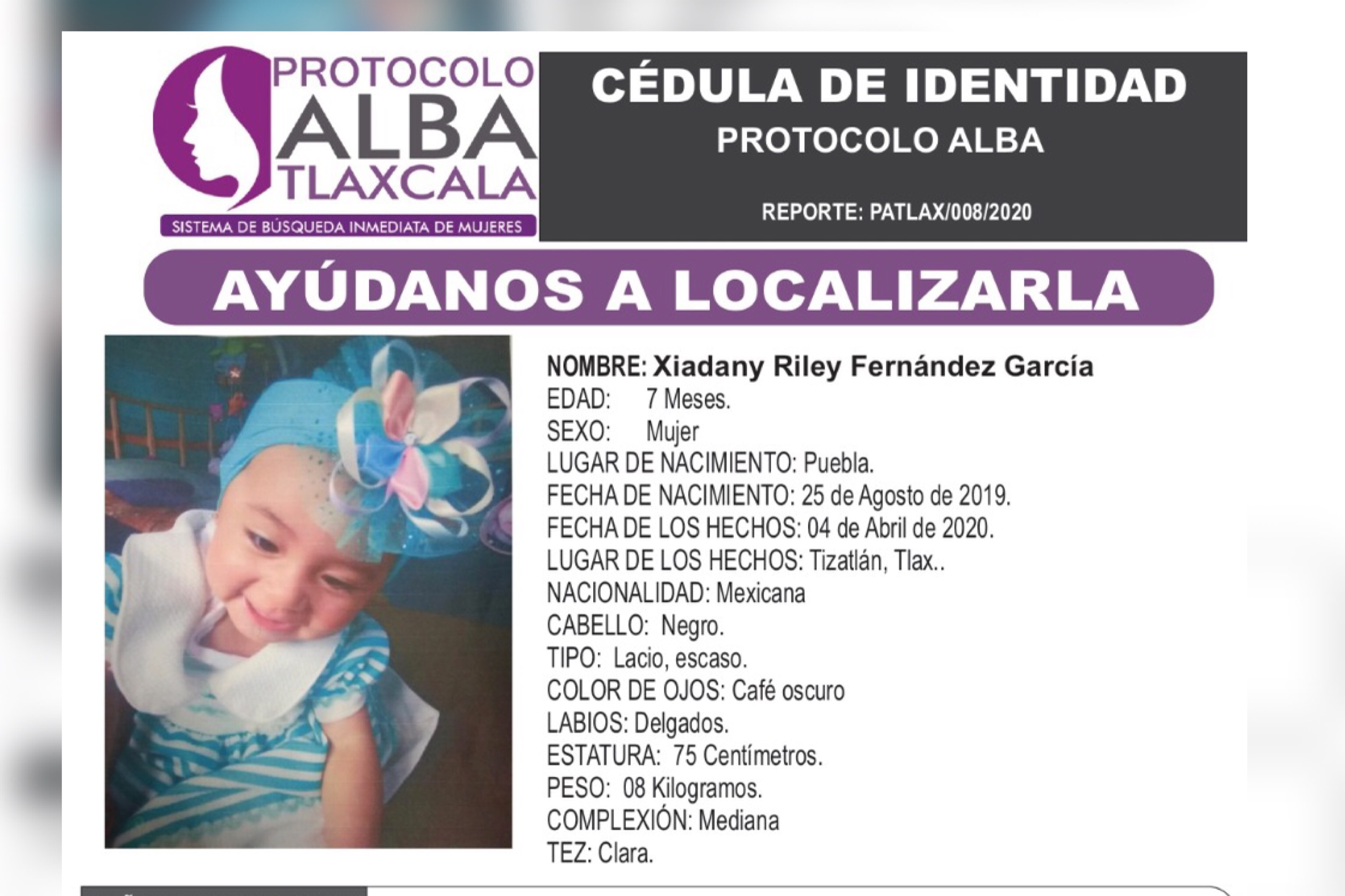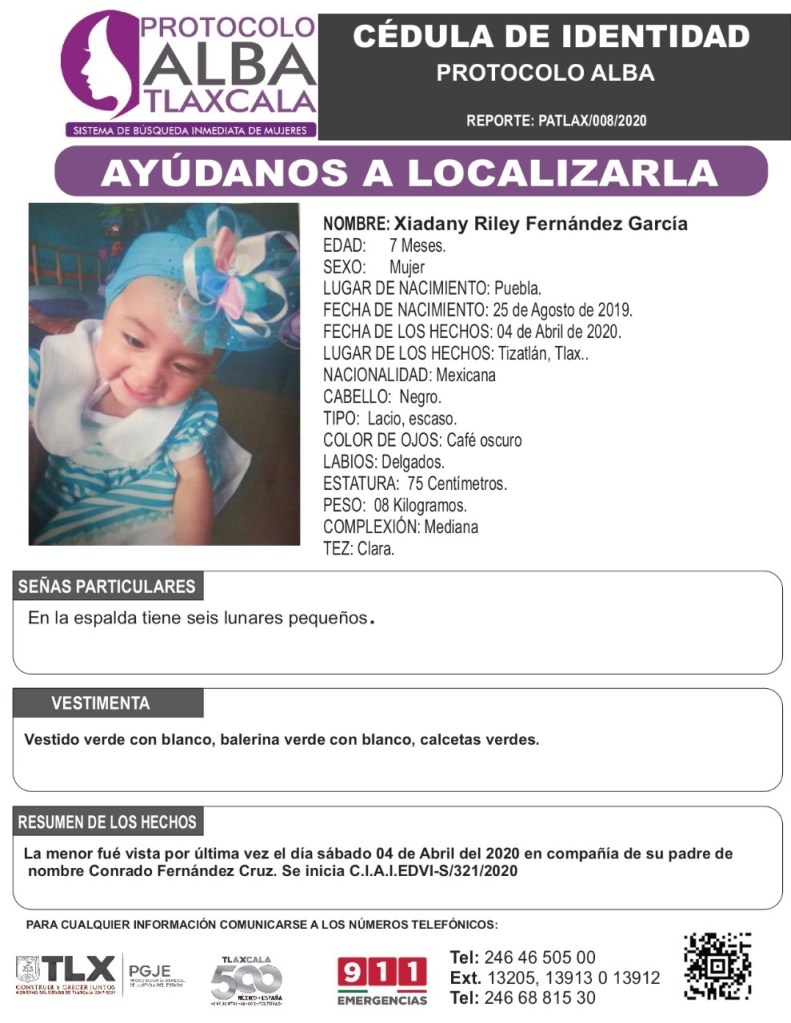 Se trata de Xiadany Riley de siete meses de edad sustraída el pasado 4 de abril en la comunidad de Tizatlán, Tlaxcala.