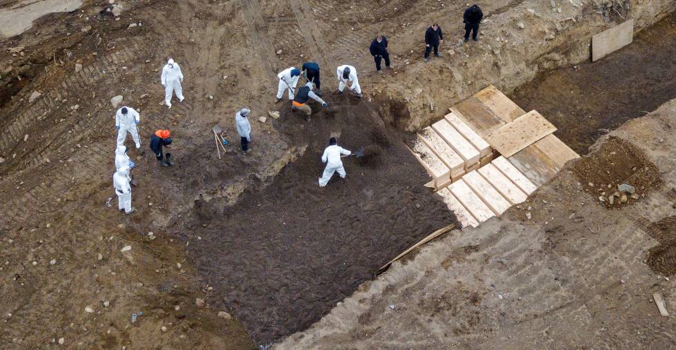 Operarios protegidos por trajes especiales entierran a fallecidos por coronavirus en la isla de Hart, por el colapso de las morgues de la ciudad. La pandemia de coronavirus ha dejado ya 15.938 muertos en Estados Unidos, donde el Estado de Nueva York ha registrado otros 779 fallecidos en el último día, lo que sitúa en 7.067 la cifra total de decesos en la región.