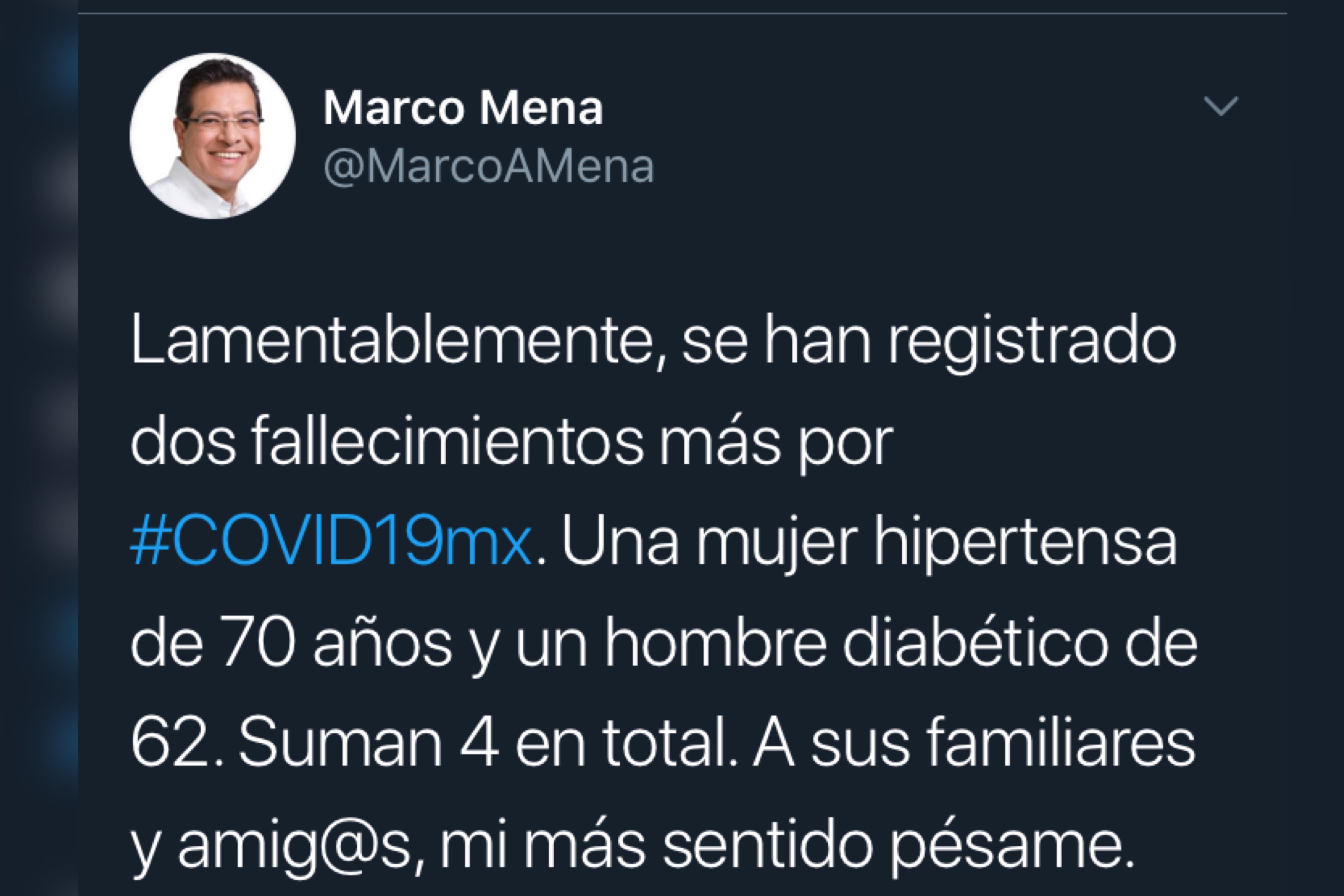 En su perfil de Twitter, el Gobernador Mena escribió: “Lamentablemente, se han registrado dos fallecimientos más por #COVID19mx. Una mujer hipertensa de 70 años y un hombre diabético de 62. Suman 4 en total. A sus familiares y amig@s, mi más sentido pésame. Los gastos funerarios los pagará el @GobTlaxcala. En serio, #QuédateEnCasa».