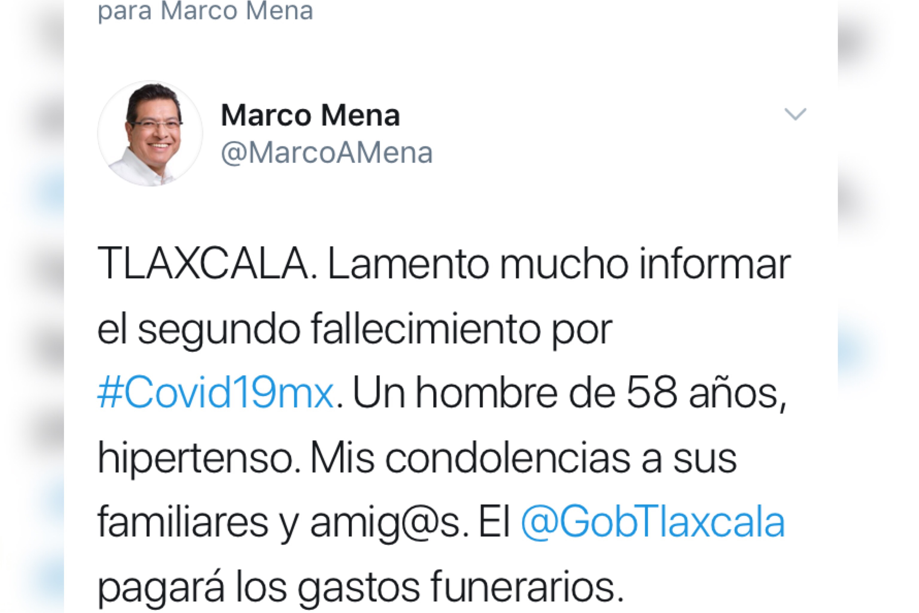 Este domingo el Gobernador de Tlaxcala, Marco Mena reportó el segundo fallecimiento de una persona por COVID-19, un hombre de 58 años de edad.