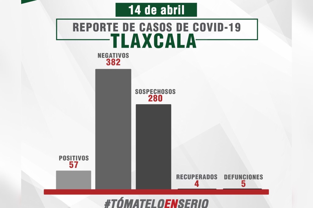 La Secretaría de Salud (SESA) confirmó tres nuevos casos, dos altas médicas y un fallecimiento más por Covid-19 en Tlaxcala, con lo que la entidad registra 57 contagios, cuatro personas recuperadas de la enfermedad y cinco fallecimientos.