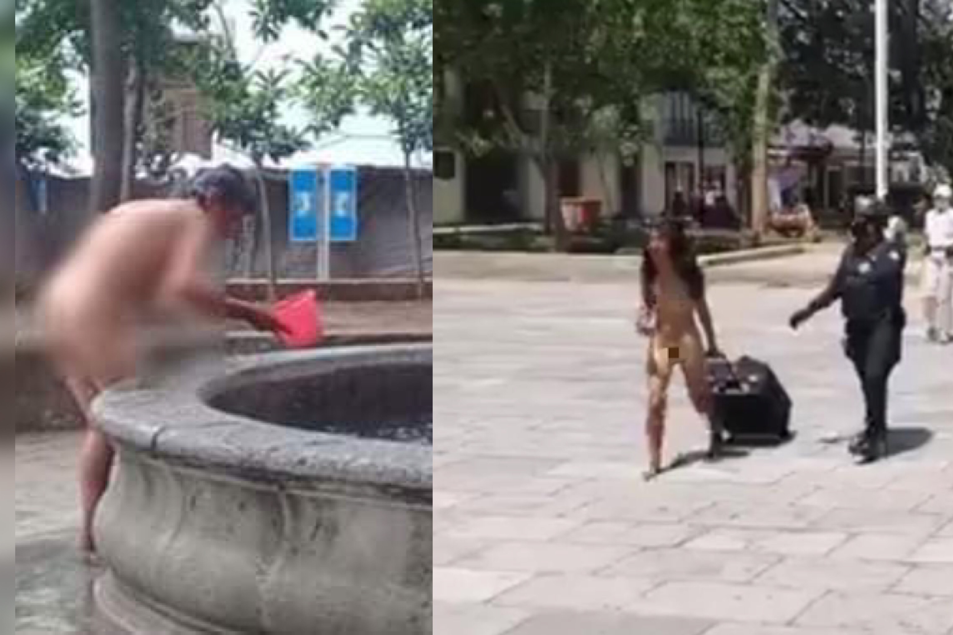 Una joven mujer con una maleta en mano fue captada desnuda en pleno zócalo de la ciudad de Oaxaca, por lo que fue detenida por las autoridades del lugar.