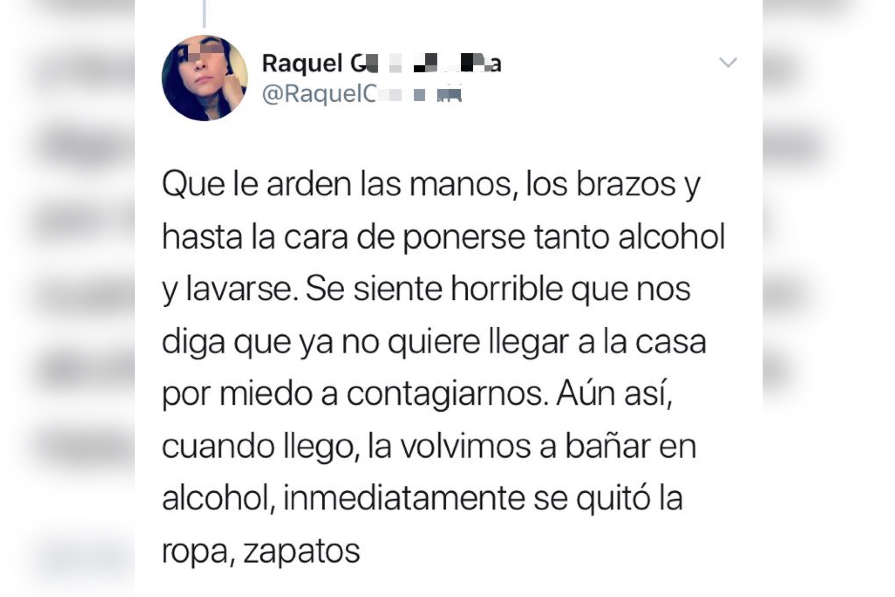 “Esta muy cansada, le duele todo y aún así mañana tiene que regresar al hospital a cumplir con sus labores, con miedo por ella y por nosotros. Sin poder quedarse a hacer home office o a descansar tomando vino y leyendo un libro, como la mayoría de los que se quejan por el encierro”.