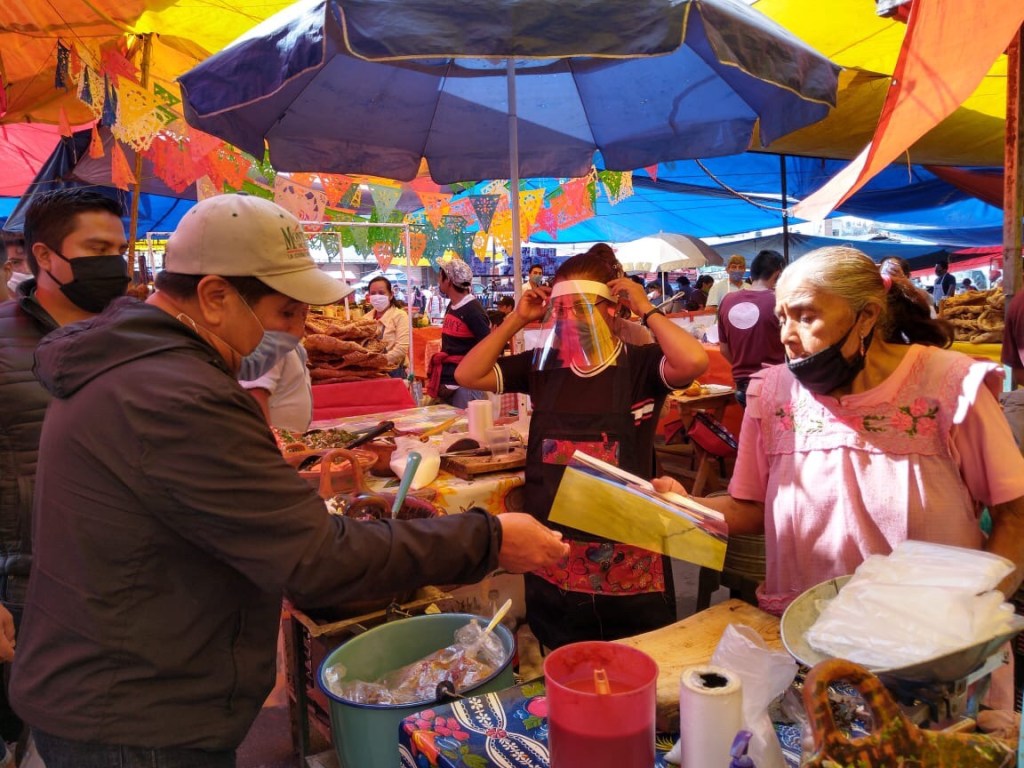 Comuna de Tlaxcala y Protección Civil estatal coordinaron esfuerzos y entregaron cubrebocas, gel y 500 caretas a tianguistas de la capital.