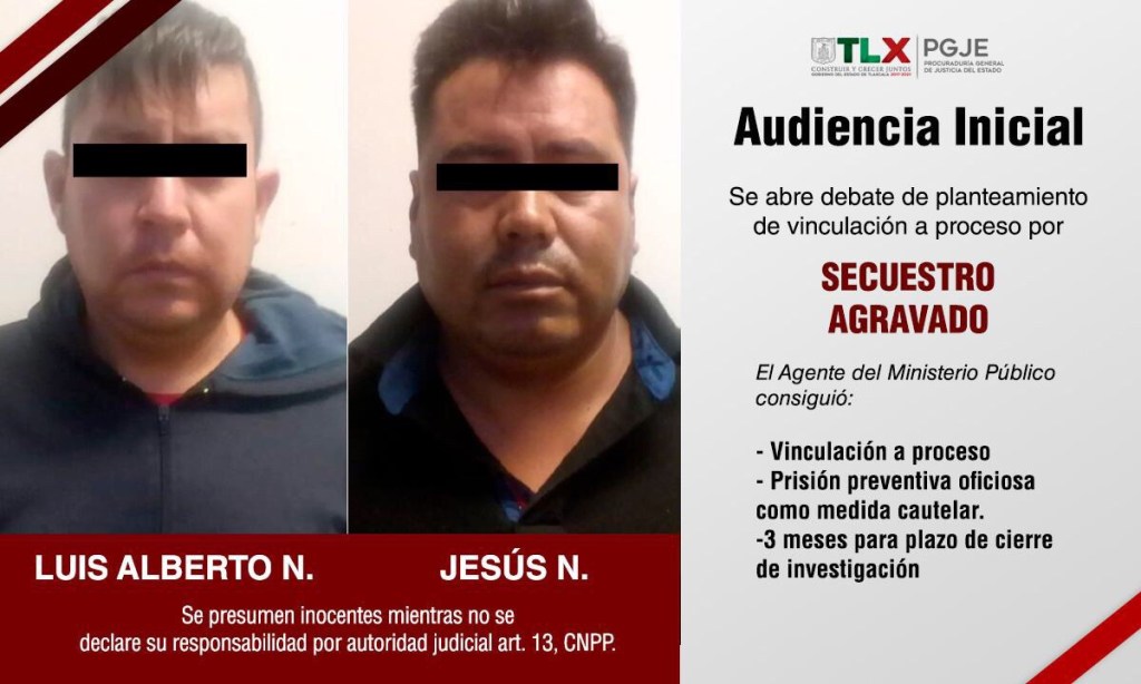 La Procuraduría General de Justicia del Estado (PGJE) consiguió de un Juez de Control la vinculación a proceso en contra de Luis Alberto N., y Jesús N., por el delito de secuestro agravado, por lo que enfrentarán su investigación en prisión preventiva oficiosa.