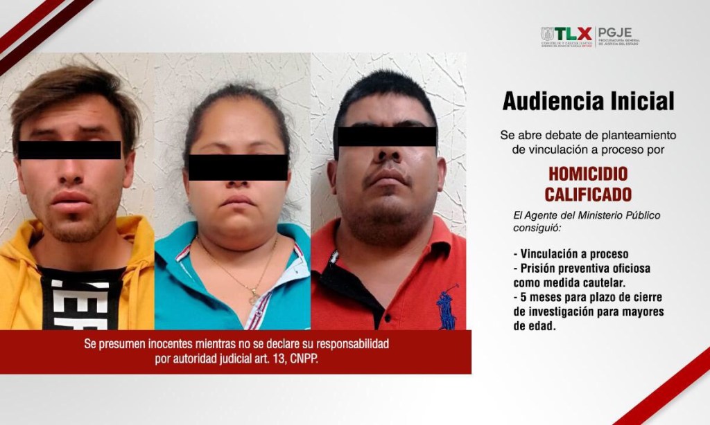 La Procuraduría General de Justicia del Estado (PGJE) a través de los datos de prueba aportados por el Agente del Ministerio Público, consiguió que la autoridad jurisdiccional vinculara a proceso a Abel N., Adrián N., y Elizabeth N., por el delito de homicidio calificado ocurrido en contra de dos personas en el mercado nuevo del municipio de Chiautempan.