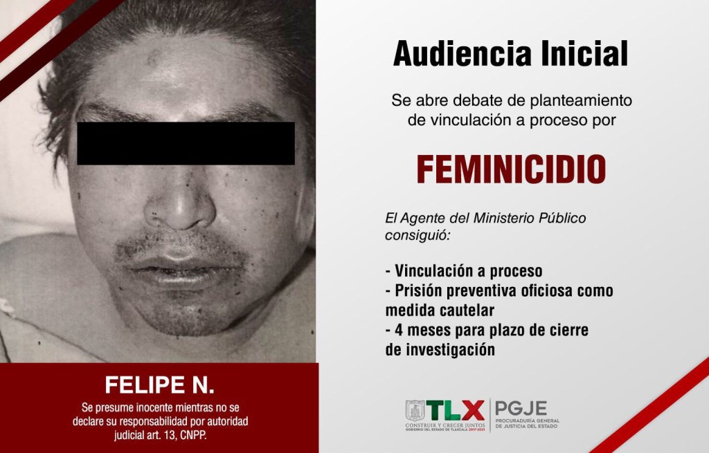 La Procuraduría General de Justicia del Estado (PGJE) consiguió durante la continuación de la audiencia inicial que el Juez de Control vinculara a proceso a Felipe N., por el delito de feminicidio luego de que privó de la vida a su expareja sentimental en el municipio de Xicohtzinco.