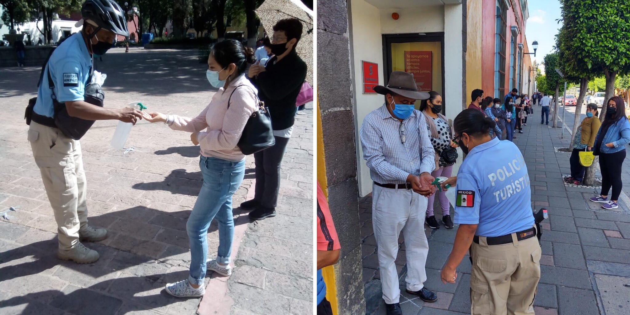 De este modo, elementos de la Policía Turística de la capital hacen presencia en sucursales bancarias y en establecimientos con servicios de cajero automático como Telmex y servicios de cable para vigilar que cuentahabientes adopten las recomendaciones de mantener distancia de dos metros con los demás usuarios y acudir solos a realizar sus trámites.