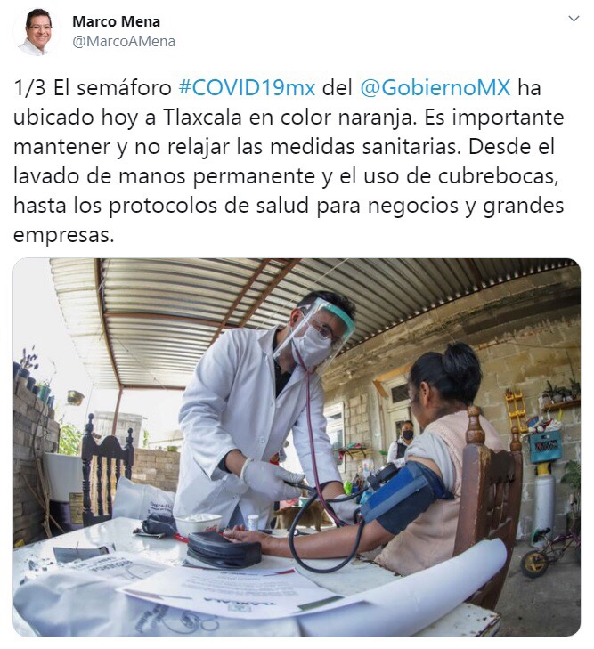En sus cuentas de Twitter y Facebook, el Gobernador Mena publicó: «1/3 El semáforo #COVID19mx del @GobiernoMX ha ubicado hoy a Tlaxcala en color naranja. Es importante mantener y no relajar las medidas sanitarias. Desde el lavado de manos permanente y el uso de cubrebocas, hasta los protocolos de salud para negocios y grandes empresas.