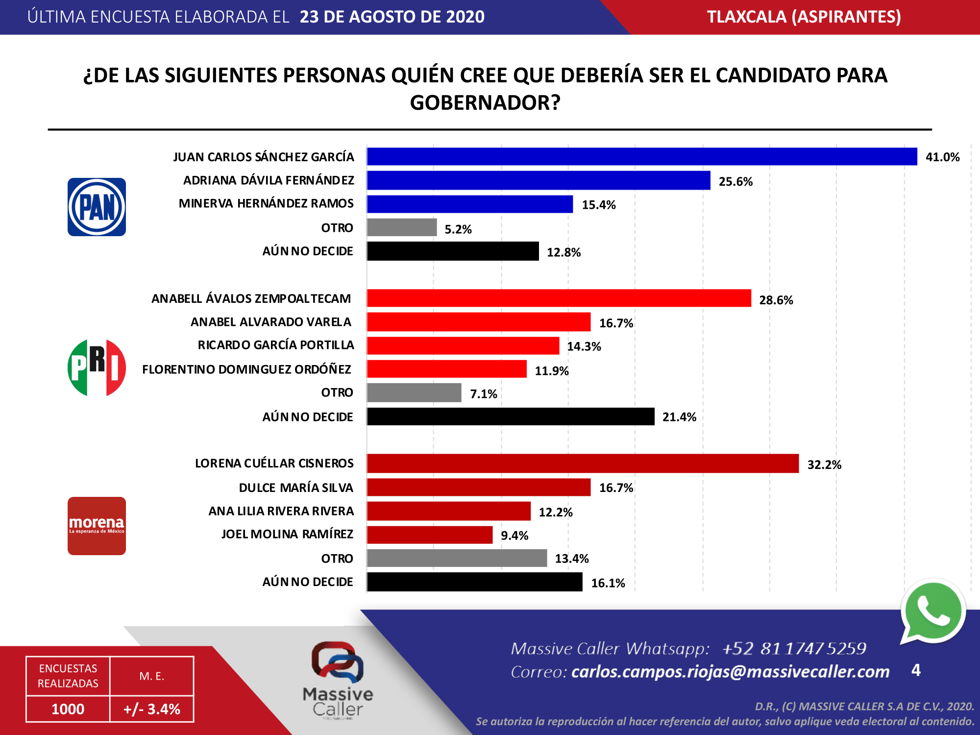 En su última encuesta elaborada el 23 de agosto, la empresa Massive Caller, ubicó a Dulce Silva en segundo lugar en las preferencias para la candidatura a la gubernatura de Tlaxcala por Morena tras desplazar en menos de dos semanas a Ana Lilia Rivera Rivera y Joel Molina Ramírez, toda vez que Lorena Cuéllar se mantiene a la cabeza, mientras que Juan Carlos Saga sería el favorito en las tres principales fuerzas políticas en Tlaxcala.