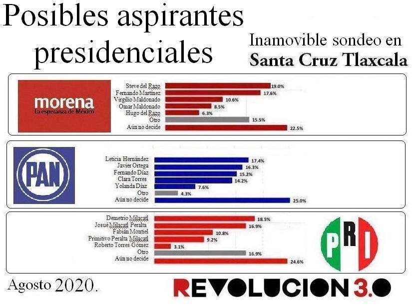 En un sondeo realizado en el mes de agosto y de manera inusual, los resultados son inamovibles –hasta ahora-sobre los posibles aspirantes a la presidencia municipal de Santa Cruz Tlaxcala, encabezando en el PAN la diputada local Leticia Hernández, Steve del Razo en Morena y Demetrio Milacatl en el tricolor.