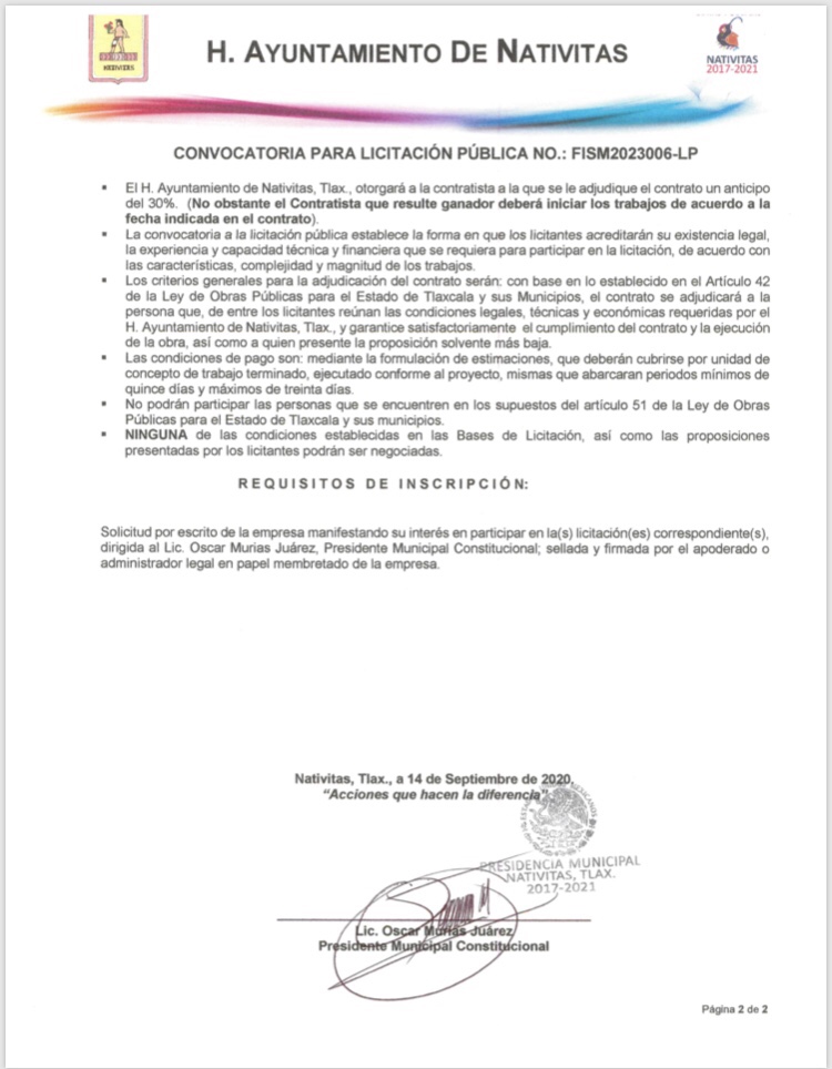 Cabe señalar que la Las bases de la licitación se encuentran disponibles para su adquisición únicamente en las oficinas que ocupan la dirección de obras públicas del Ayuntamiento de Nativitas.