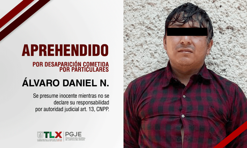 La Procuraduría General de Justicia del Estado de Tlaxcala (PGJE) en coordinación con la Fiscalía General de Justicia del Estado de México (FGJEM), lograron la captura de Álvaro Daniel N., quien contaba con una orden de aprehensión por el delito de desaparición cometida por particulares en victimización de Daniela N.