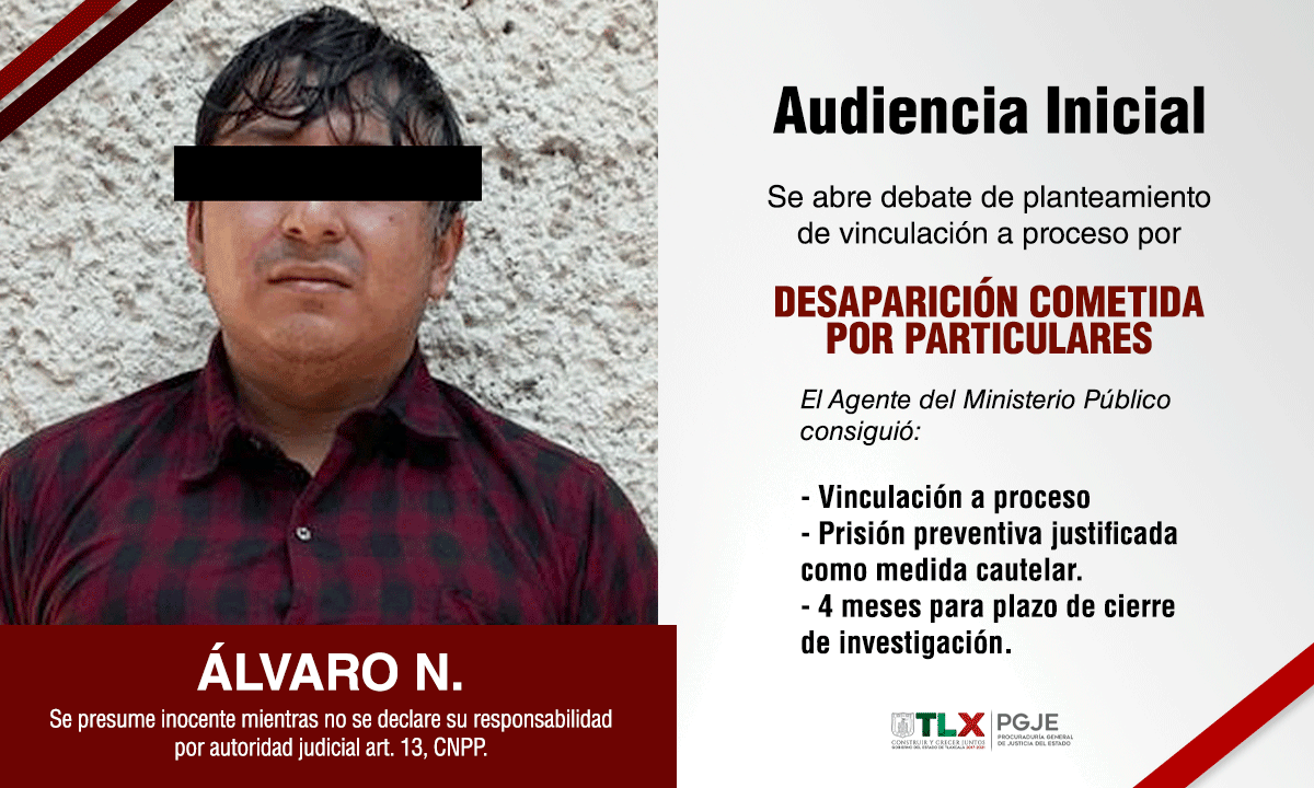 La Procuraduría General de Justicia del Estado (PGJE) consiguió durante la continuación de la audiencia inicial, que el Juez de Control determinara la vinculación a proceso y prisión preventiva oficiosa en contra de Álvaro N., por el delito de desaparición cometida por particulares, en victimización de Daniela N.