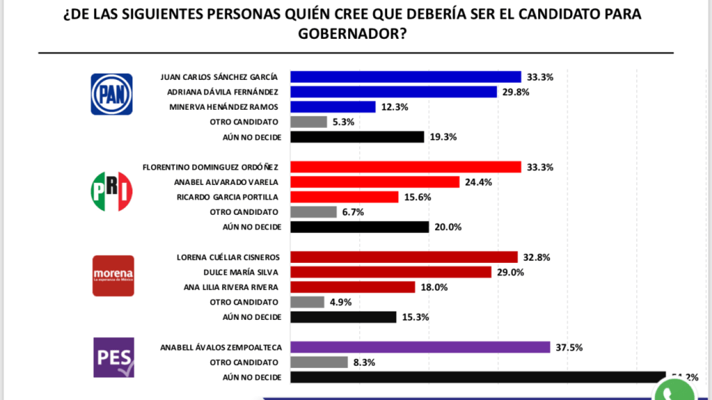 Conviene destacar que en el PAN, Juan Carlos Sánchez García rebasó, con 33.3 unidades a Adriana Dávila Fernández (29.8) con una clara tendencia a romper el empate técnico. Por su parte Minerva Hernández Ramos se rezagó en una tercera posición, con 12.3 puntos, añade Massive Caller.