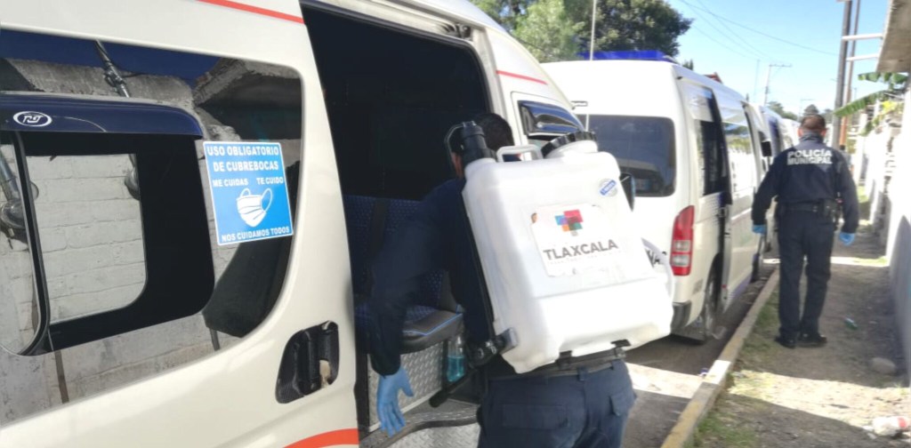 Elementos de la Dirección de Seguridad Pública del Ayuntamiento de Tlaxcala realizan acciones pertinentes para desinfectar unidades del transporte público en la capital, con el objetivo de inhibir la propagación del Covid-19.