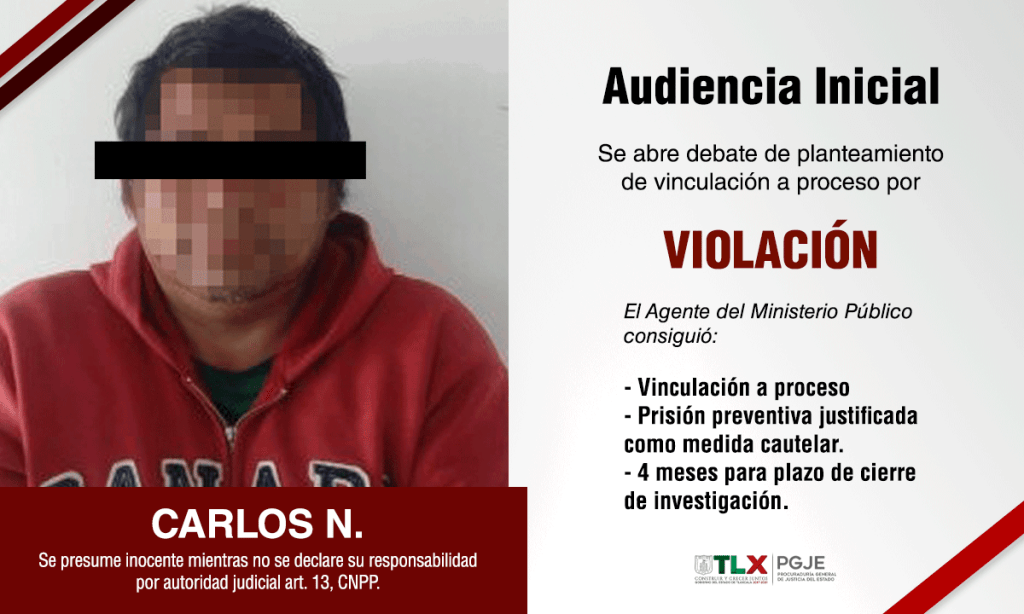La Procuraduría General de Justicia del Estado (PGJE) consiguió de un Juez de Control la vinculación a proceso en contra de Carlos N., por el delito de violación en agravio de su hija en el municipio de Teolocholco.