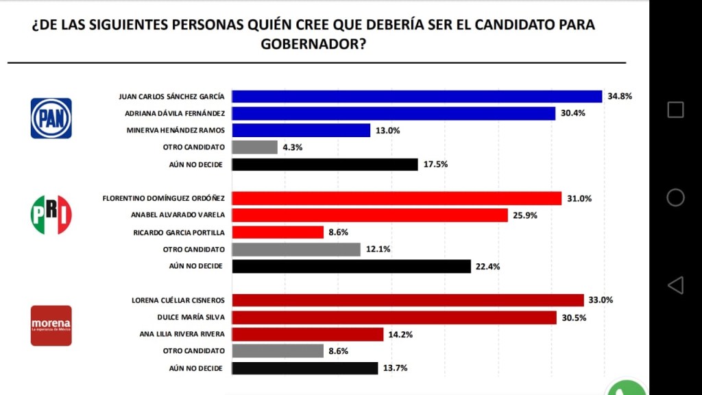 A la pregunta, ¿Quien considera usted qué debería ser candidata al gobierno de Tlaxcala, 33.0 de los encuestados mencionó a Lorena ; 30.5 lo hizo por Dulce, y solo 14.7 prefirió a Ana Lilia Rivera. En este rubro persiste el empate técnico entre Dulce y Lorena, aunque la dinámica alcanzada en el corto plazo por la empresaria tlaxcalteca muestra cómo de cara a la elección de 2021, observa una clara tendencia a seguir creciendo.