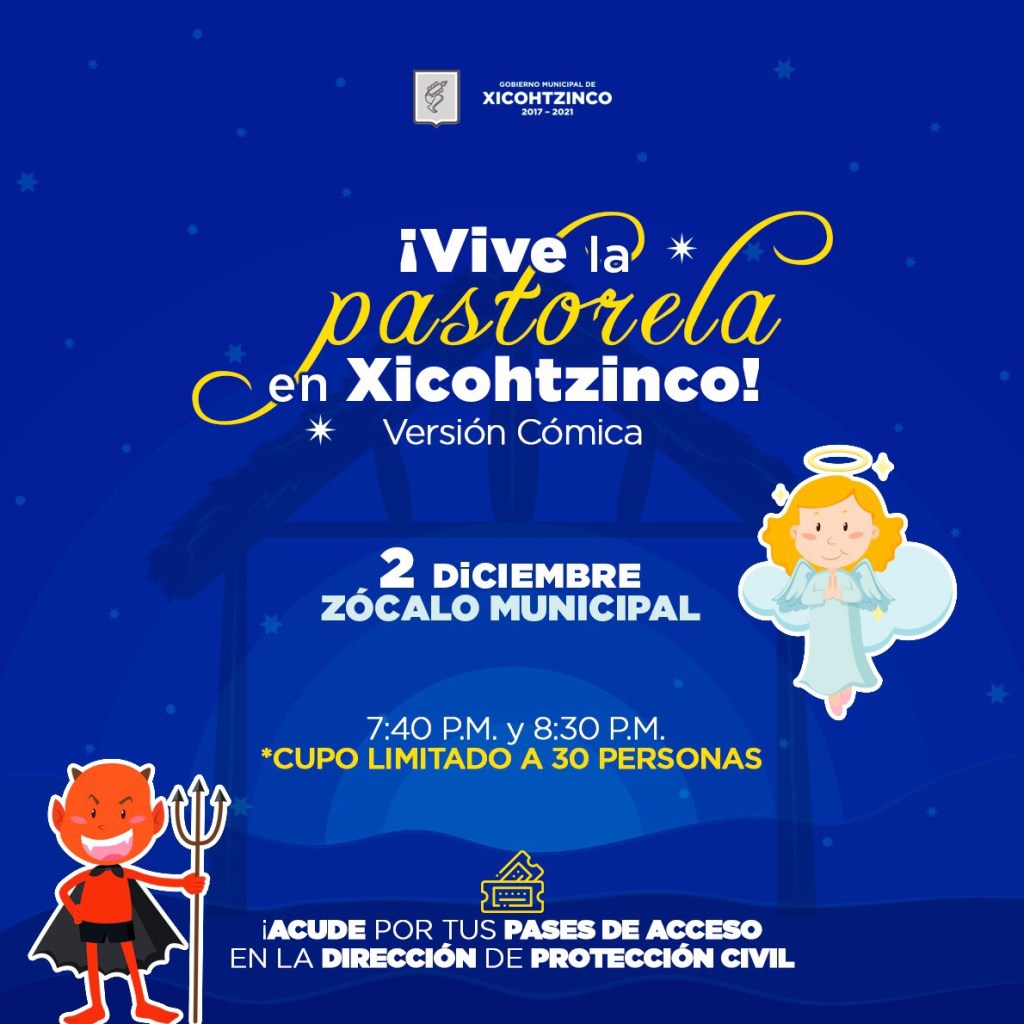 El Gobierno Municipal y el Sistema DIF de Xicohtzinco llevarán a cabo una pastorela durante el Encendido de árbol y la Aldea Navideña para disfrute de las familias de la comuna con estricto protocolo de sanidad debido a la contingencia sanitaria que existe.