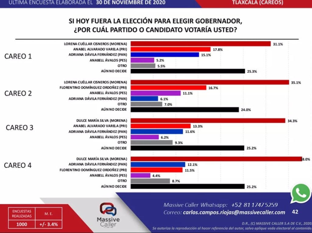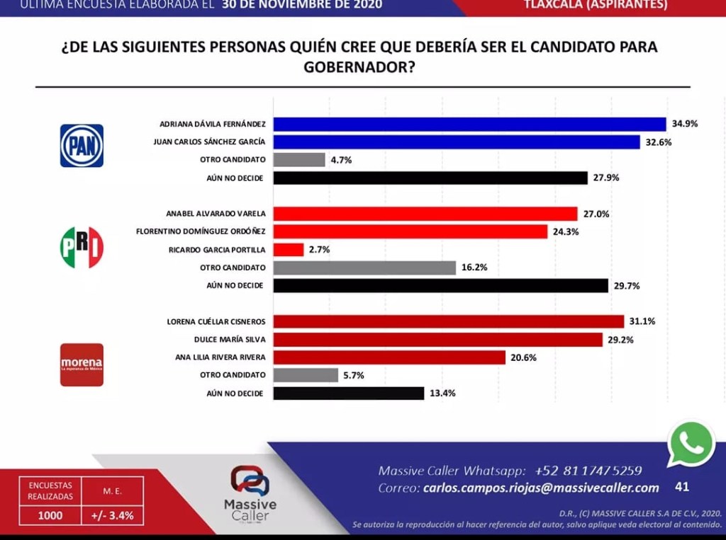 En empate técnico resultó la pregunta: ¿Quién cree que deba ser candidato a gobernador/a de Tlaxcala?. La ex delegada federal y la empresaria morenista tienen estas cifras: Cuéllar 31.1, Silva 29.2, rezagada Ana Lilia Rivera con 20.6 por ciento.